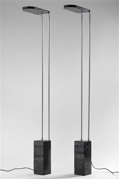 Coppia di lampade da terra modello "Gesto terra". Produzione Skipper, Italia, 1974. Base in marmo venato, struttura in metallo cromato e laccato bianco. (h cm 221) (difetti e restauri)