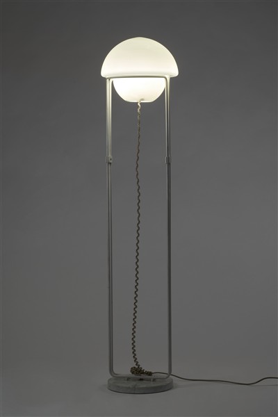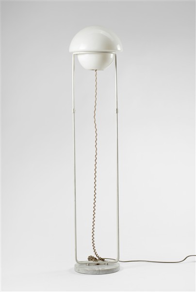 Lampada da terra. Produzione Peguri, Italia, 1966ca. Metallo laccato bianco, vetro incamiciato lattimo. (h cm 164) (lievi difetti)