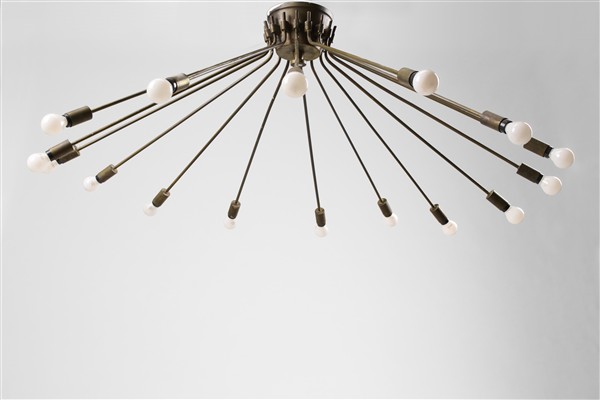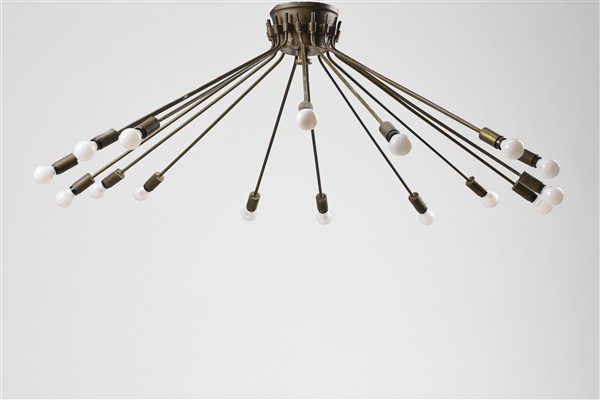 Lampada a plafone a raggiera con sedici bracci in ottone. Italia, anni '40. (d cm 115) (difetti)