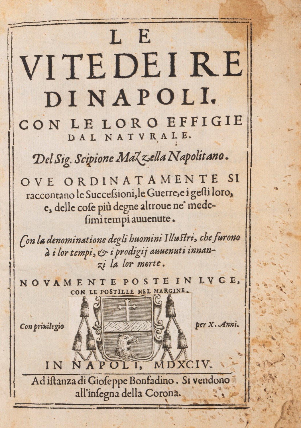 Napoli, ad istanza di Gioseppe Bonfadino. Si vendono all'insegna della Corona, 1594. In 4°. Due parti in un vol. Al frontespizio incollata sulla marca un'arma gentilizia, 12 ritratti e vari stemmi, manca una carta iniziale, restauri, alcune carte brunite, legatura del XVIII sec. in piena pergamena, tagli a spruzzo rosso e blu.Napoli, ad istanza di Gioseppe Bonfadino. Si vendono all'insegna della Corona, 1594. In 4°. Due parti in un vol. Al frontespizio incollata sulla marca un'arma gentilizia, 12 ritratti e vari stemmi, manca una carta iniziale, restauri, alcune carte brunite, legatura del XVIII sec. in piena pergamena, tagli a spruzzo rosso e blu.