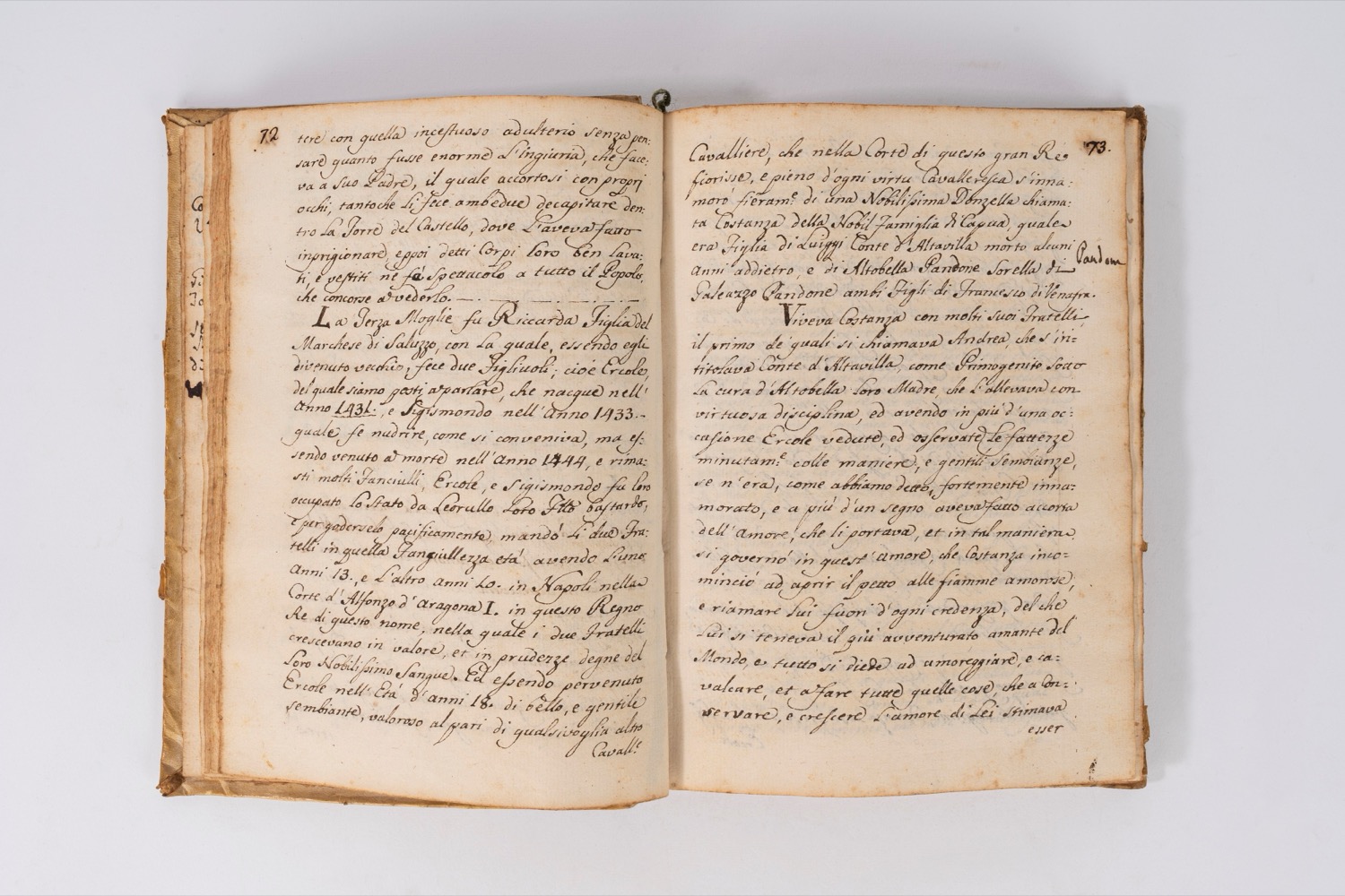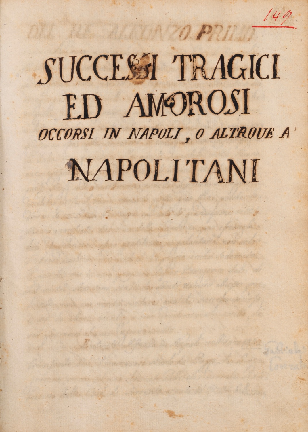 Manoscritto cartaceo di 382 pp. numerate, vergato da un'unica mano, che sviluppa cronologicamente le vicende reali e immaginarie di amori celebri partenopei, a partire dagli amori di Re Alfonso Primo (1442) sino a Gaspare Sersale, fine sec.XVII. Molto interessante tutto l'ampio capitolo dedicato alla storia di Suor Giulia di Manco, o di Marco, raccolta in oltre 100 pp., la cui "setta della Carità Carnale" fu uno dei maggiori scandali napoletani della fine del sec.XVI. Manoscritto cartaceo di 382 pp. numerate, vergato da un'unica mano, che sviluppa cronologicamente le vicende reali e immaginarie di amori celebri partenopei, a partire dagli amori di Re Alfonso Primo (1442) sino a Gaspare Sersale, fine sec.XVII. Molto interessante tutto l'ampio capitolo dedicato alla storia di Suor Giulia di Manco, o di Marco, raccolta in oltre 100 pp., la cui "setta della Carità Carnale" fu uno dei maggiori scandali napoletani della fine del sec.XVI.