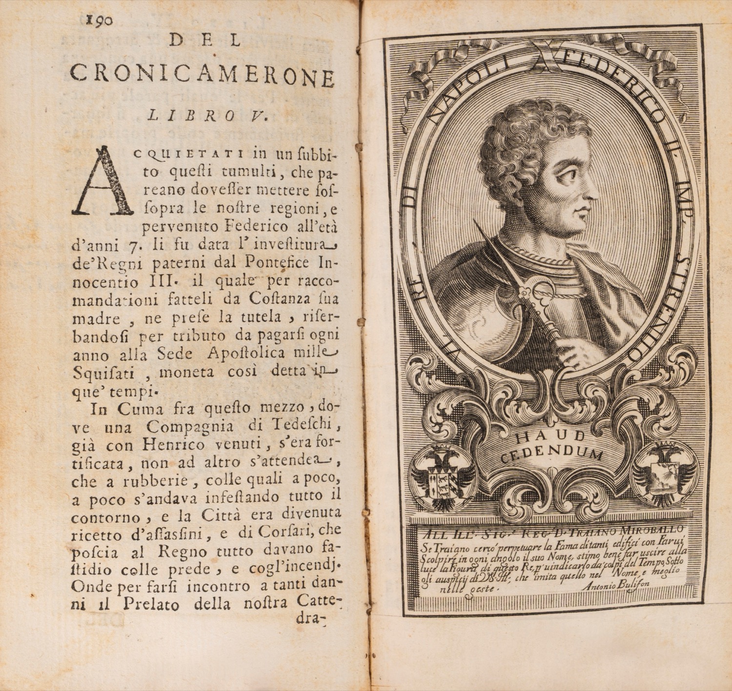 Napoli, a spese dell'autore, 1690 [In Napoli, Giuseppe Roselli, 1690]. In 12°. Con 13 tavole incise tra cui il ritratto dell'Autore in antiporta, alberi genealogici e ritratti di regnanti, frontespizio inciso, piccola macchia al margine inferiore del frontespizio, foro di tarlo al margine inferiore dei primi fascicoli, usuali lievi fioriture, qualche carta brunita, legatura coeva in piena pergamena, titolo manoscritto al dorso, lievi difetti. Al frontespizio timbro di appartenza datato Napoli 1880, al contropiatto ex libris cartacei del Marchese Annibale Berlingieri e di Pietro Berlingieri.Napoli, a spese dell'autore, 1690 [In Napoli, Giuseppe Roselli, 1690]. In 12°. Con 13 tavole incise tra cui il ritratto dell'Autore in antiporta, alberi genealogici e ritratti di regnanti, frontespizio inciso, piccola macchia al margine inferiore del frontespizio, foro di tarlo al margine inferiore dei primi fascicoli, usuali lievi fioriture, qualche carta brunita, legatura coeva in piena pergamena, titolo manoscritto al dorso, lievi difetti. Al frontespizio timbro di appartenza datato Napoli 1880, al contropiatto ex libris cartacei del Marchese Annibale Berlingieri e di Pietro Berlingieri.