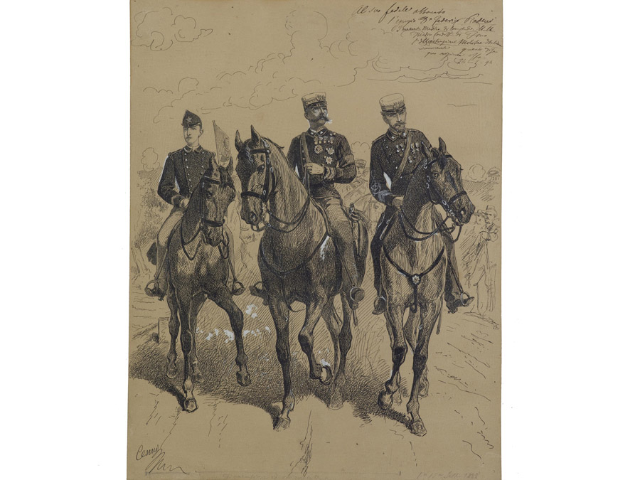 Quinto Cenni (1845–1917) Soldati a cavallo in uniforme italiane della seconda metà del XIX secolo china su carta 32,3x25 cm