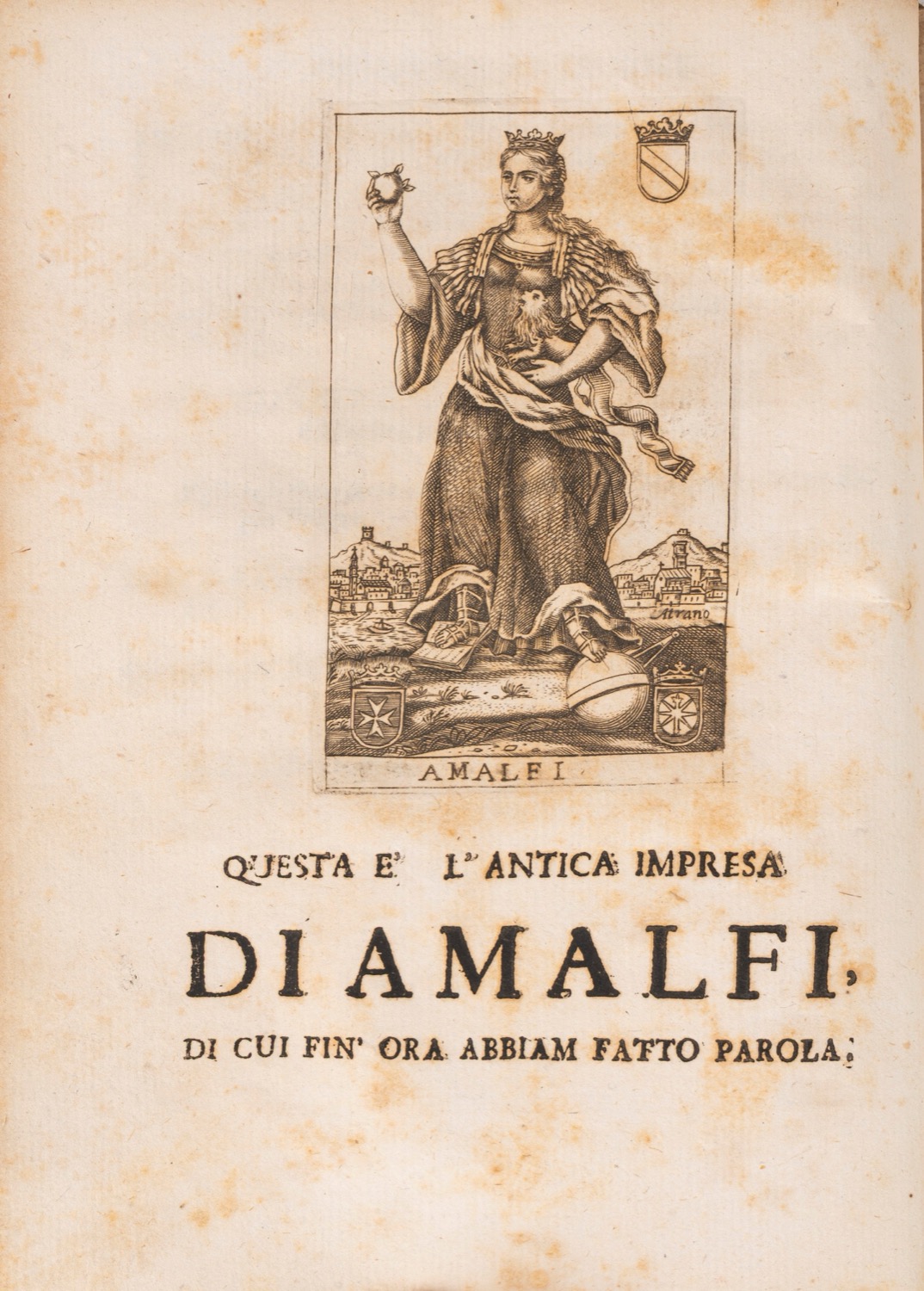Napoli, Paolo Severini, 1724. In 4°. 2 volumi, ritratto dell'autore inciso in rame ed "Antica impresa di Amalfi" fuori testo, fioriture e bruniture, legatura coeva in piena pergamena, titolo scritto al dorso, tagli a spruzzo rossi, sciupate. Napoli, Paolo Severini, 1724. In 4°. 2 volumi, ritratto dell'autore inciso in rame ed "Antica impresa di Amalfi" fuori testo, fioriture e bruniture, legatura coeva in piena pergamena, titolo scritto al dorso, tagli a spruzzo rossi, sciupate.