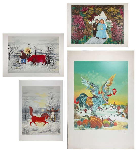 Lotto composto da quattro litografie a colori di pittori Naif, di soggetti e mi