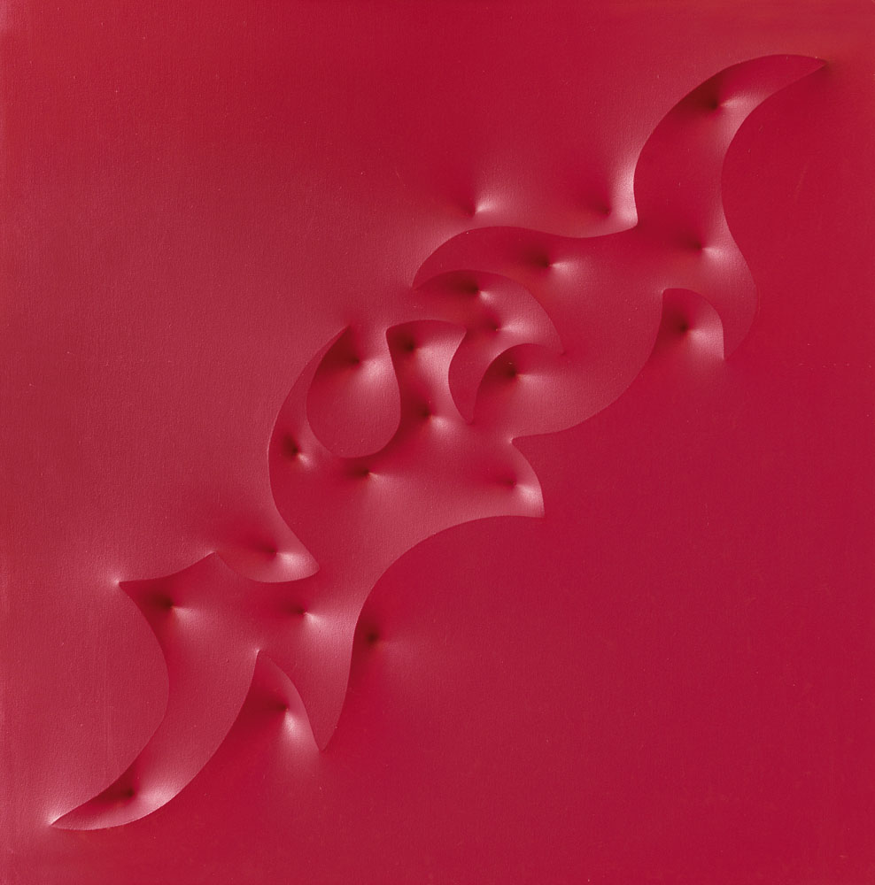 AMADIO GIUSEPPE Todi 19/05/1944Denatela estroflessa rossa cm. 80x80, firma e...