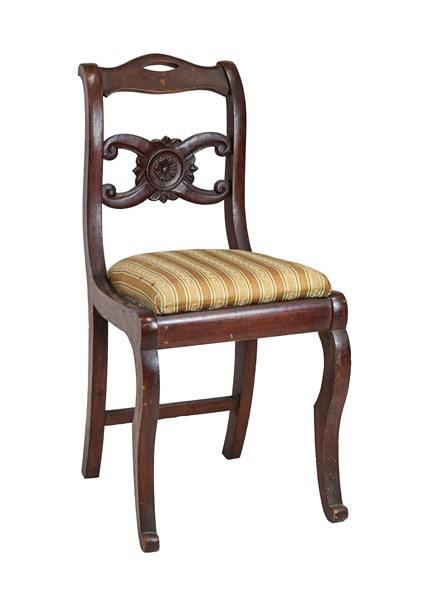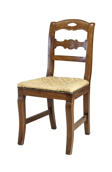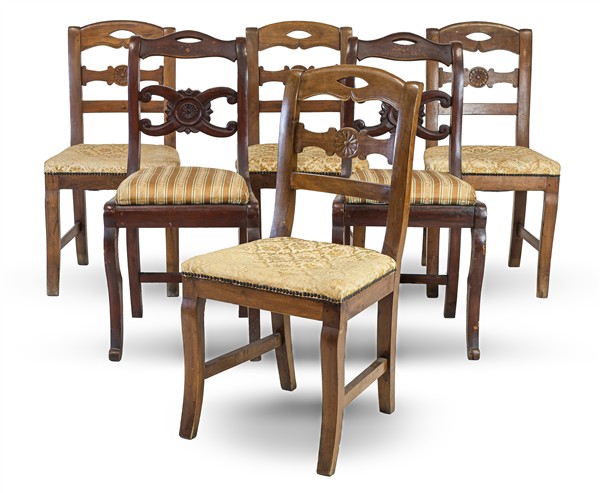 Lotto composto da gruppo di quattro sedie con schienali a giorno e cartella intagliata e traforata unito ad una coppia di sedie di simile decoro. Secolo XIX (difetti)