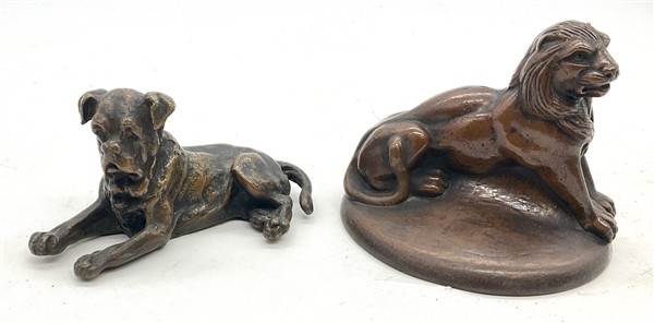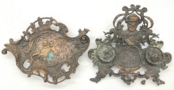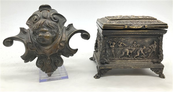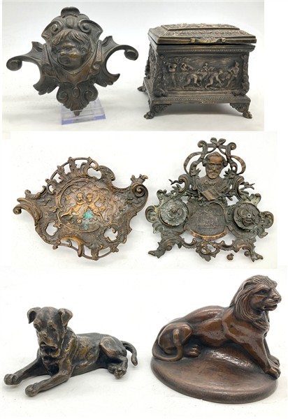 Lotto composto da un portagioie, due fermacarte di cui uno a forma di cane e uno a forma di leone, un fregio sagomato in bronzo uniti ad un calamaio e un centrotavola in metallo. Secolo XIX-XX (difetti e piccole mancanze)