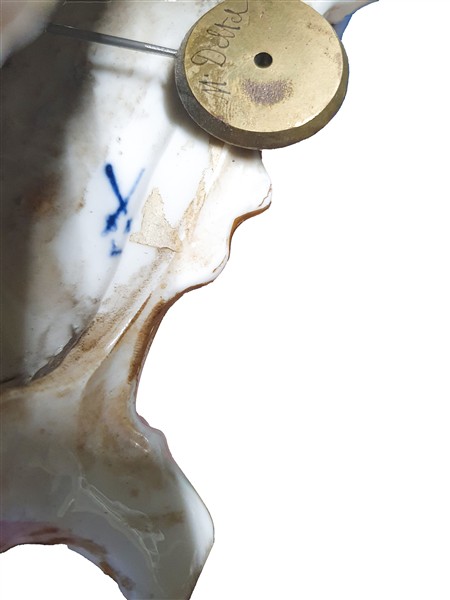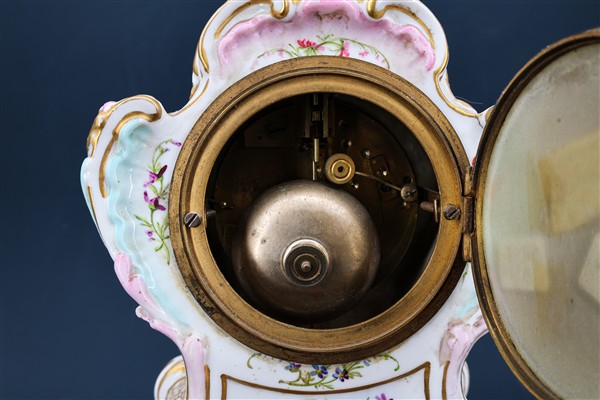 Pendola da appoggio in porcellana policroma marcata Maple & Company Paris a motivi rocaille e fiori. Quadrante in smalto bianco a numeri romani per le ore e arabi per i minuti, movimento a due treni con suoneria delle ore e mezze su campanello. Unita a base lignea (h. max cm 35,5) (difetti)
