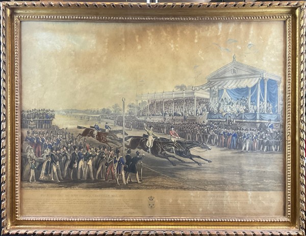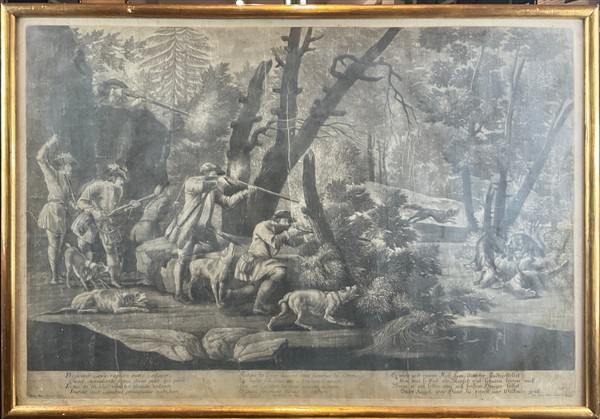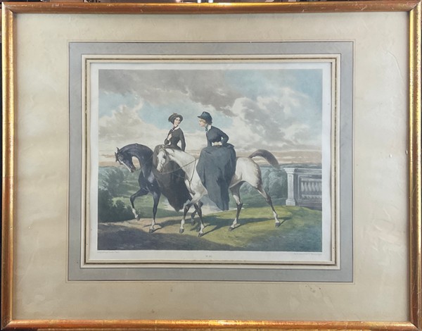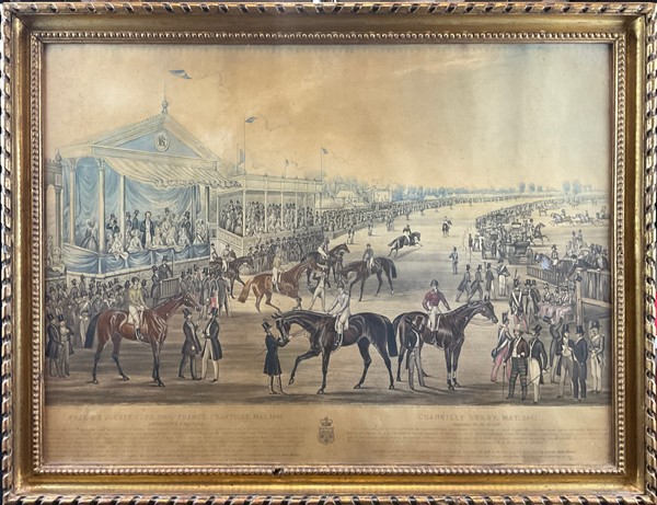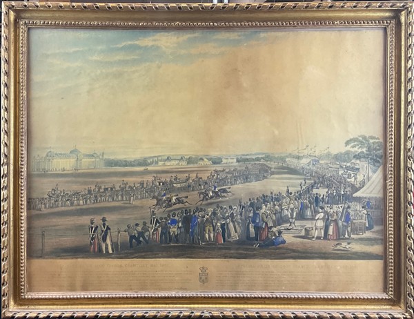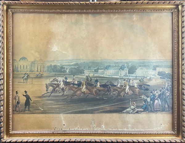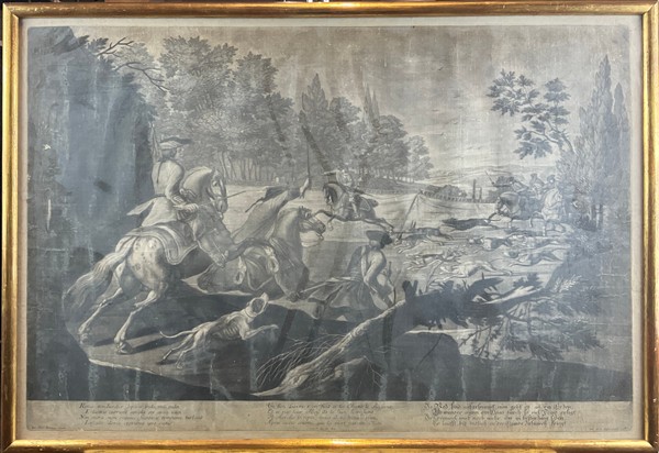 Lotto composto da due incisioni di Cristoforo Dall'Acqua dalla serie "Composizioni Architettoniche del Bibbiena" intitolate "Porto Reale" e "Cortile Regio", due mezzotinti di J.A. Pfeffel da dipinti di J.E. Ridinger raffiguranti scene di caccia, quattro stampe a colori di C. Hunt da dipinti di G.B. Campion e J.F. Herring raffiguranti scene all'ippodromo e due cromolitografie di E. Planas raffiguranti dame a cavallo, di misure differenti