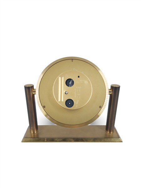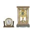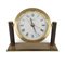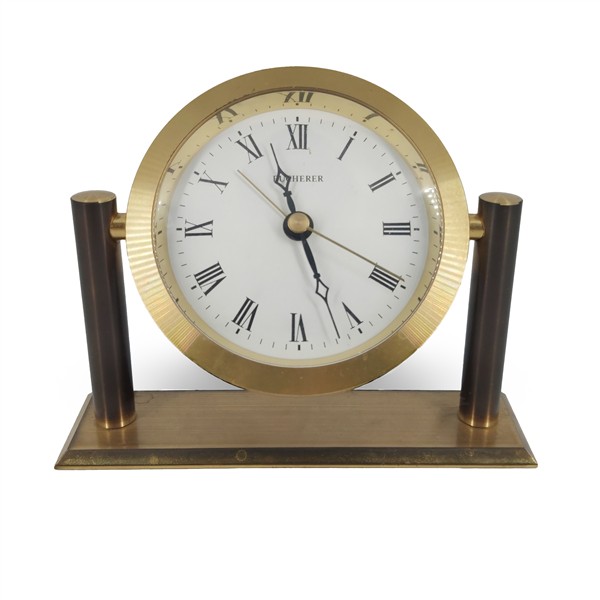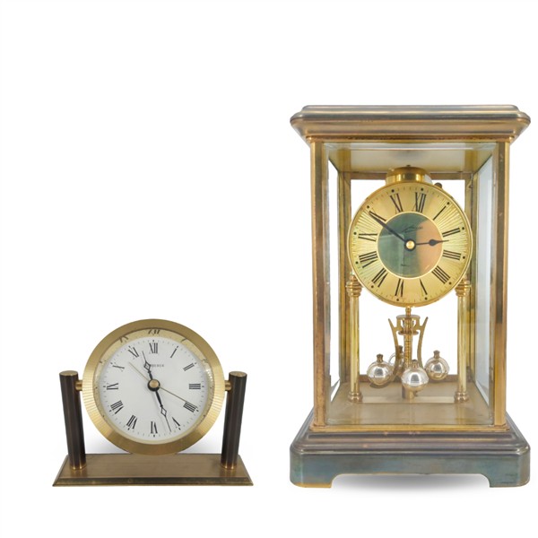 Lotto composto da una pendola del tipo "quattrocento giorni" con cassa in vetro e ottone al quarzo (h. cm 28) e un orologio da scrivania in metallo con quadrante firmato Bucherer al quarzo (h. cm 12) (difetti)
