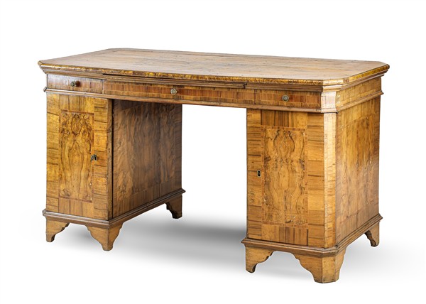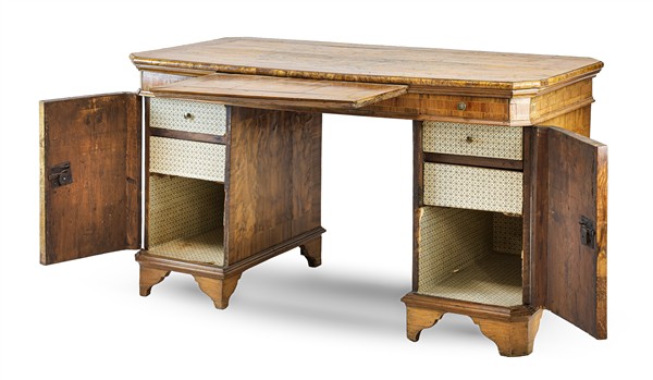 Scrivania da centro lastronata e filettata in legni vari con fronte a due sportelli celanti tiretti e tre cassetti sottopiano, piedi a mensola. Veneto, fine secolo XVIII (cm 137x77x67) (difetti, restauri e sostituzioni)