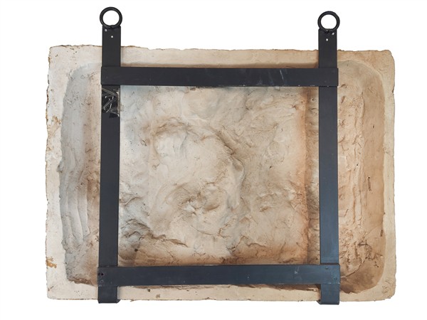 Calco in gesso dorato di forma rettangolare a figura maschile con mantello, cav