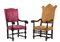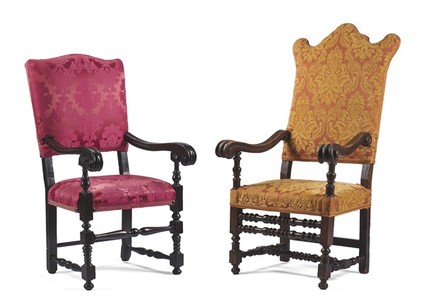 Due antichi seggioloni in legno intagliato, schienale sagomato, braccioli terminanti a ricciolo, gambe e traverse tornite (difetti)
