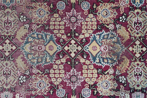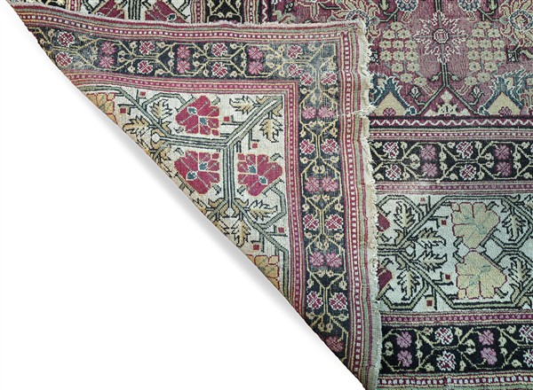 Tappeto Dorosh, Persia, secolo XX. Decoro all over con motivi floreali su fondo ciclamino. Bordura principale con tralci e fiori su fondo bianco (cm 430x415) (difetti e rapature)