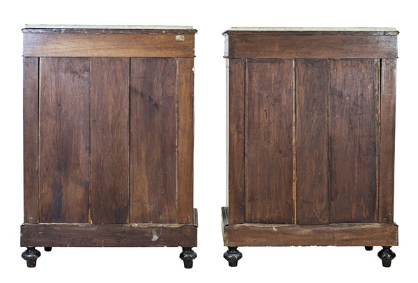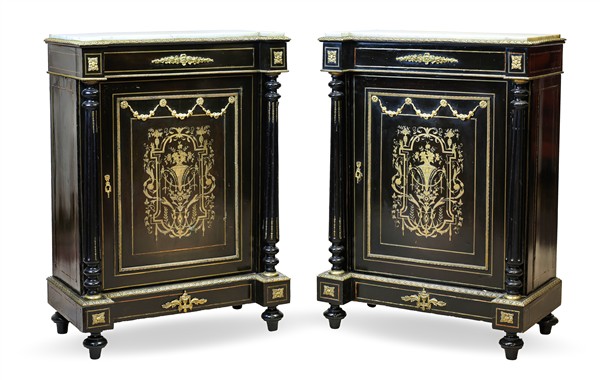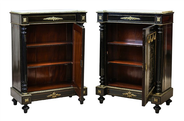 Coppia di credenzini in legno ebanizzato e filettato in ottone, fronte ad un'anta con pannellatura intarsiata a vasi fioriti e motivi stilizzati in ottone, montanti a colonna scanalata e tornita, piedi a cipolla, fregi e bordure in metallo dorato, piani sagomati in marmo bianco incassato. Fine secolo XIX (cm 79x110x42) (difetti e mancanze)