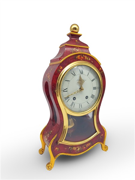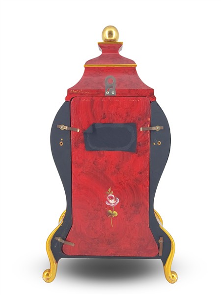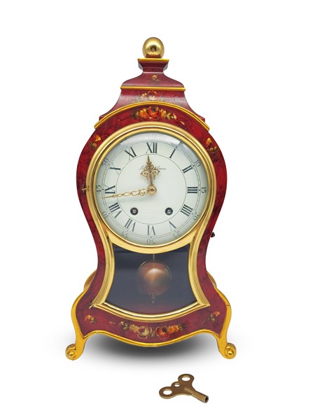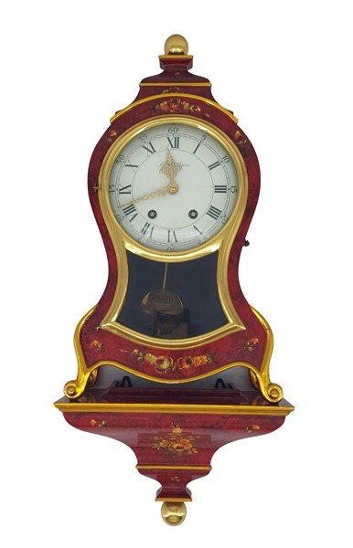 Pendola di produzione moderna del tipo "Neuchateloise" con mensola in legno laccato a decori floreali. Quadrante in smalto bianco a numeri romani per le ore e arabi per i minuti, movimento a due treni con suoneria delle ore e mezze su campanello (h. cm 58) (difetti)