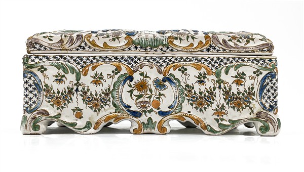 Manifattura francese, secolo XIX. Scatola con coperchio in maiolica dipinta in