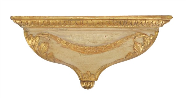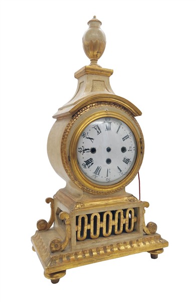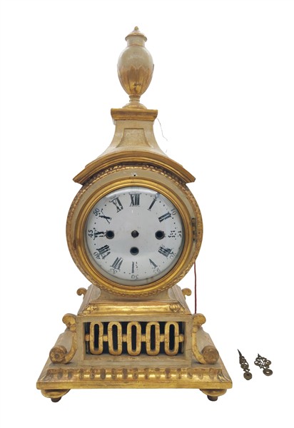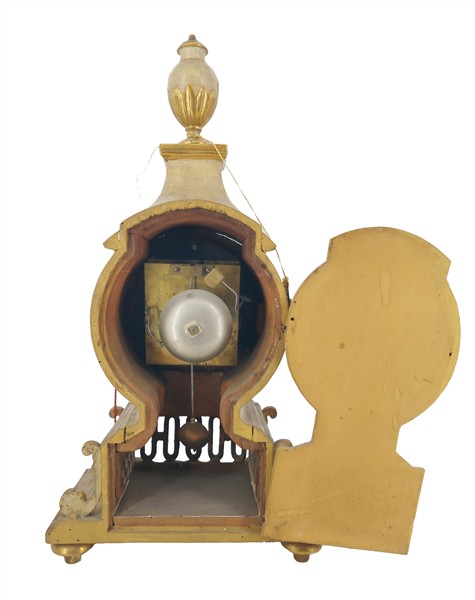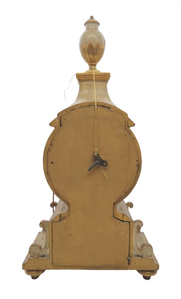 Pendola in legno su mensola con cassa laccata e dorata, quadrante a numeri romani per le ore e arabi per i minuti. Movimento a tre treni con suoneria delle ore e dei quarti su campanelli, scappamento a verga. Seconda metà del secolo XVIII (h. max cm 84) (difetti e possibile sostituzione del quadrante)