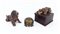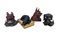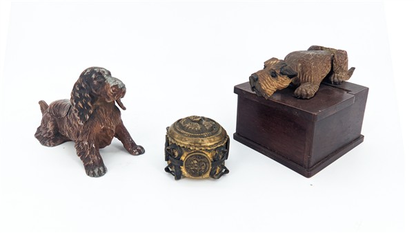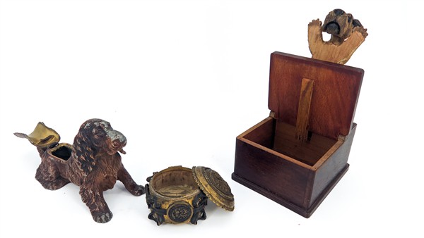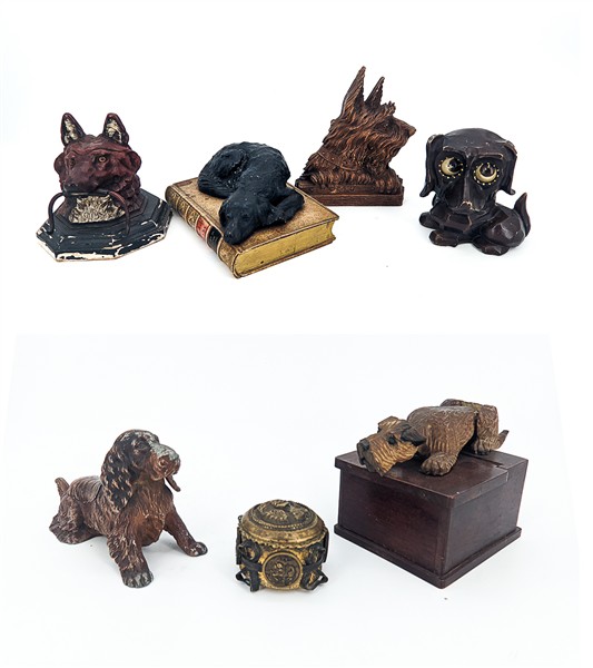 Lotto composto da sette diversi oggetti in legno, metallo e altri materiali differenti con soggetti a forma di cane tra cui un calamaio, un portafiammiferi e un orologio d'appoggio (cm max 18x8x13) (difetti)