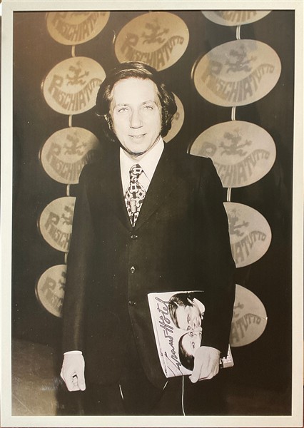 Mike Bongiorno negli studi di Rischiatutto con la rivista Grand Hotel, stampa su forex (cm 115x78,5) in cornice (difetti)