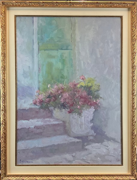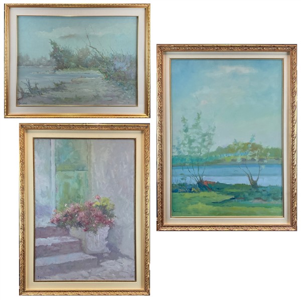 Due dipinti raffiguranti "Paesaggi" e uno raffigurante "Composizione con fiori"