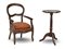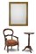 Lotto composto da una specchiera con cornice in legno e pastiglia dorata (cm 106x86), una poltrona con schienale traforato del secolo XIX ed un tavolino con piano circolare e base tripode (d cm 45, h 79) (difetti)