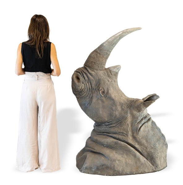 Grande testa di rinoceronte in vetroresina dipinta in policromia (cm 155x85x109
