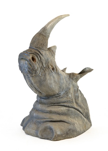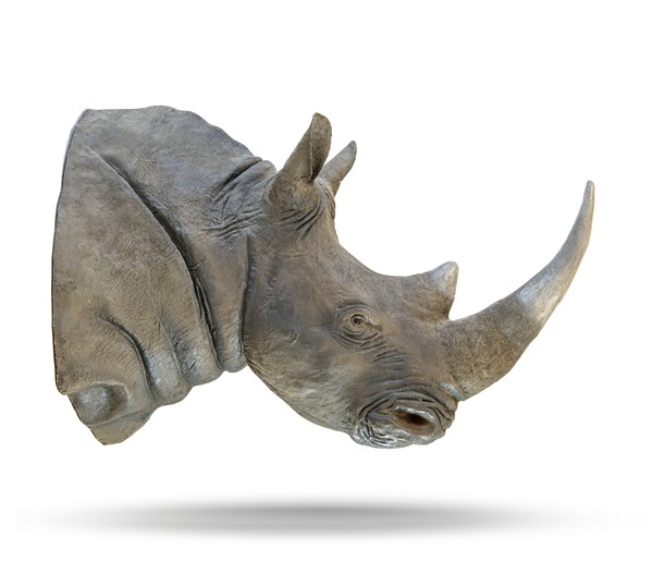 Grande testa di rinoceronte in vetroresina dipinta in policromia (cm 155x85x109) (difetti).