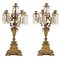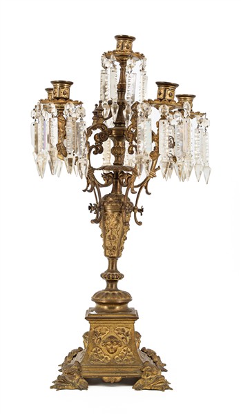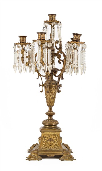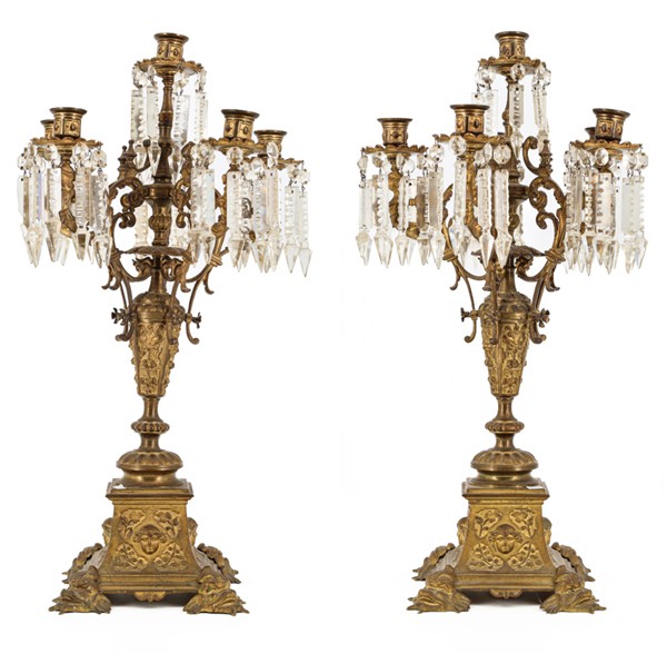 Coppia di candelabri a sei fiamme in metallo dorato con sostegno a balaustro su base quadrata e piedi a mascherone, pendenti in vetro sfaccettato. Fine secolo XIX (h cm 55) (difetti e mancanze)
