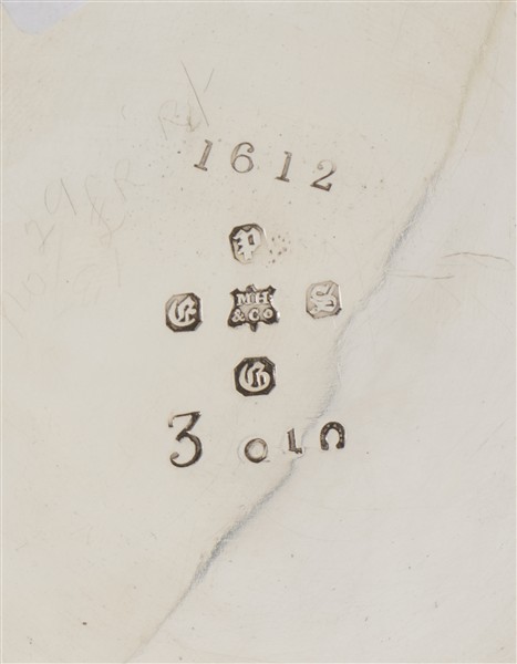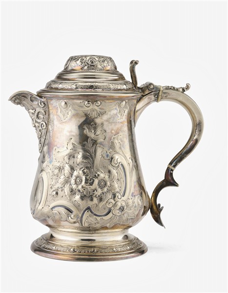 Tankard in old sheffield sbalzato a volute, foglie e fiori, versatoio a mascher