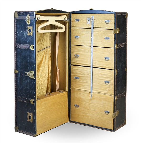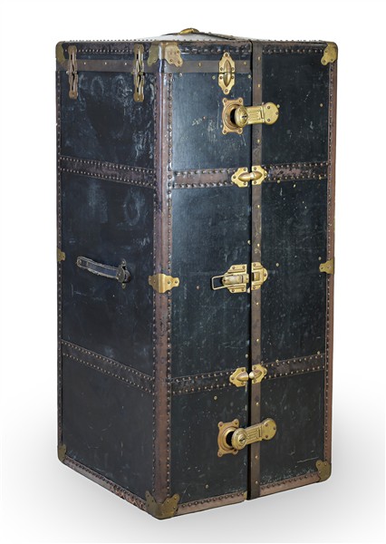 Baule guardaroba da viaggio in legno tinto con bordure in metallo rivettato, interno a diversi scomparti e cassetti con appendiabiti. Inizio secolo XX. (cm 120x56x56) (difetti e piccole mancanze)