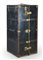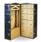 Baule guardaroba da viaggio in legno tinto con bordure in metallo rivettato, in