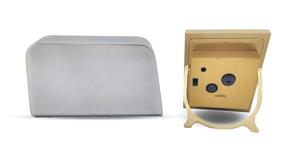 Lotto composto da un orologio-termometro da tavolo con cassa in metallo marcato Piquadro in scatola originale, ed una sveglia da scrivania con meccanismo al quarzo marcato Angelus (h. max cm 9) (difetti)