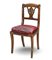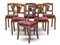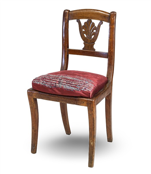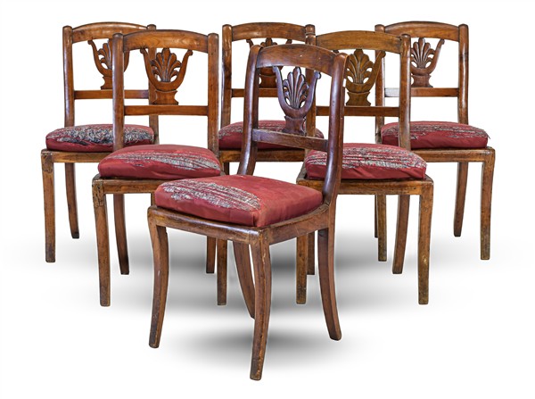 Gruppo di sei sedie in noce con schienale a cartella traforata e intagliata a palmetta, gambe a sciabola. Secolo XIX (difetti)