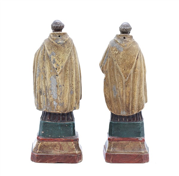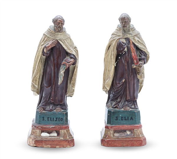 Manifattura del secolo XIX. Coppia di figure in terracotta dipinta in policromia raffiguranti Sant'Elia e Sant'Eliseo con base a reliquiario (h max cm 24) (difetti e piccole mancanze)