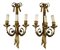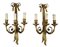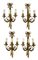 Gruppo di quattro appliques a tre luci in metallo dorato cimate da nastro traforato con bracci a volute fogliate (h cm 43) (difetti)