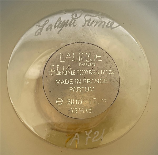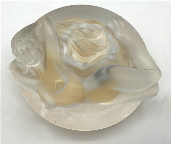 Lalique. Portaprofumo in vetro trasparente soffiato in stampo con tappo a guisa di donna sdraiata (h cm 7,5 d cm 11,5) (difetti)