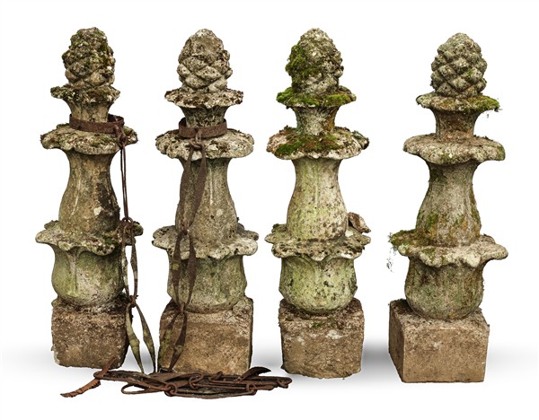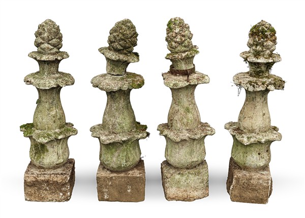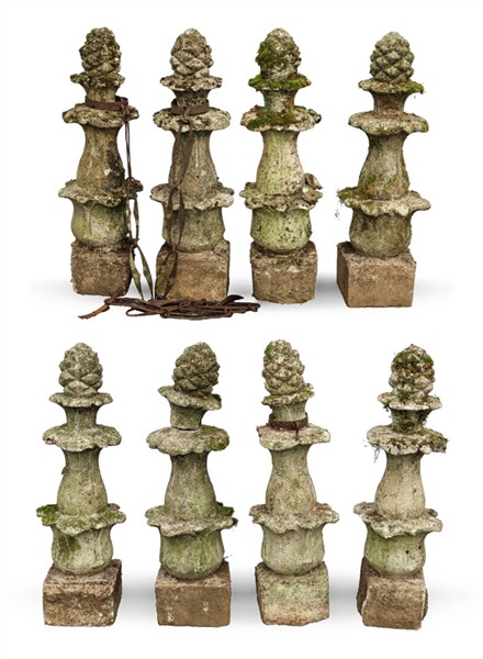 Gruppo di otto pilastrini da giardino sagomati a foglie con cimatura a pigna. Inizio secolo XX (h max cm 82). (Difetti, rotture e piccole mancanze)
