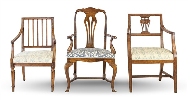 Lotto di tre diverse poltrone in legno intagliato con schienali a giorno. Secolo XIX (difetti)