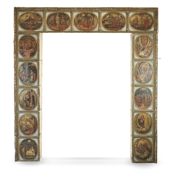 "Tre pannelli di pala d'altare in legno intagliato e laccato contenenti quindici storie della Vita di Cristo e della Vergine dipinti ad olio entro riserve ovali"
