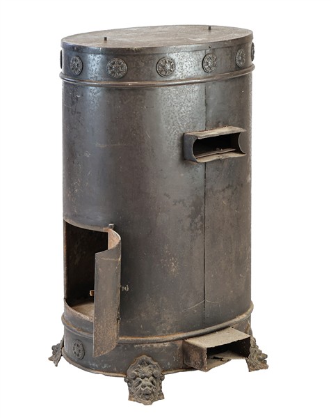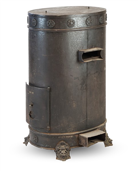 Stufa a sezione ovale in ferro con piedini a testa leonina, fascia superiore e inferiore decorata da umboni. Secolo XIX (cm 42x106x39) (difetti e mancanze)