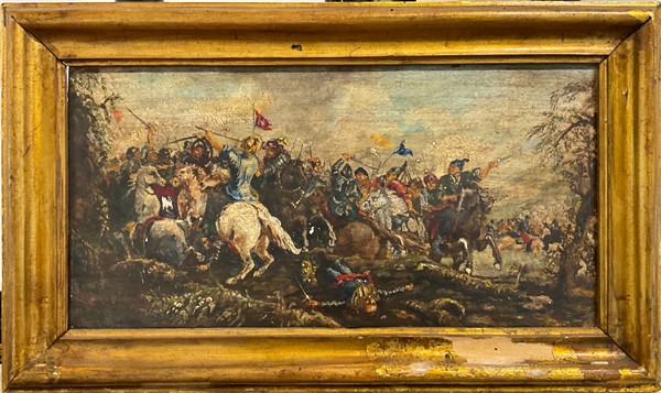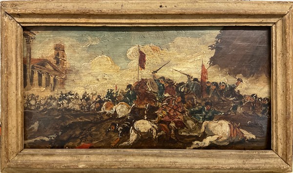 Nel gusto del secolo XVII "Scene di battaglie" coppia di dipinti ad olio su ta
