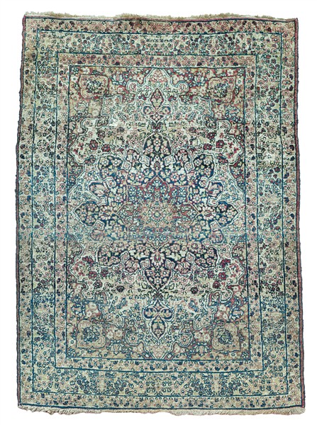 Tappeto Kirman, Persia, fine secolo XIX. Decoro con medaglione nei toni del blu, azzurro, ciclamino e rosa (cm 165x122) (difetti e rapature)