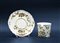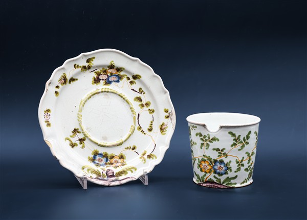 Manifattura emiliana del secolo XVIII. Lotto composto da un vaso (h cm 11) e un sottotazza in maiolica dipinta in policromia "al tacchiolo" (d cm 23,5) (difetti)