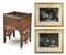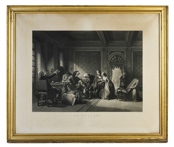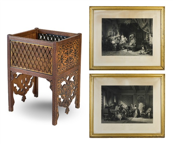 Lotto composto da un mobiletto contenitore in legno intagliato a bassorilievo su fondo ebanizzato e doppia pannellatura traforata e dorata (cm 48x67x41) e due litografie su carta raffiguranti scene di genere (cm 74x89) in cornici dorate (difetti e piccole mancanze)
