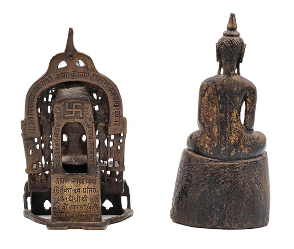 Manifatture orientali, secolo XX. Lotto composto da tre figure di divinità in bronzo e una in legno intagliato (h max cm 21) (difetti)