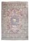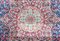 Tappeto Kirman Laver, Persia, fine secolo XIX. Decoro con grande medaglione nei toni del ciclamino, azzurro e rosa su campo bianco. Importanti angolari a fondo ciclamino con rami fioriti somiglianti ai piumaggi della corona dello Scià. Molteplici bordure, la principale di grandi dimensioni con andamento a meandro presenta un cartiglio in lingua persiona con scritta in bianco su fondo ciclamino (cm 655x533) (difetti e rapature)