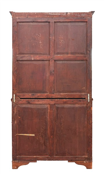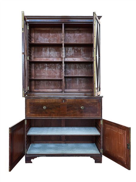 Bureau bookcase impiallacciato in mogano e filettato, parte inferiore a due sportelli pannellati e un cassetto con fronte ribaltabile celante numerosi tiretti e vani a giorno, parte superiore a due ante con vetro riquadrato. Inghilterra, secolo XIX (cm 129x239x57) (difetti)