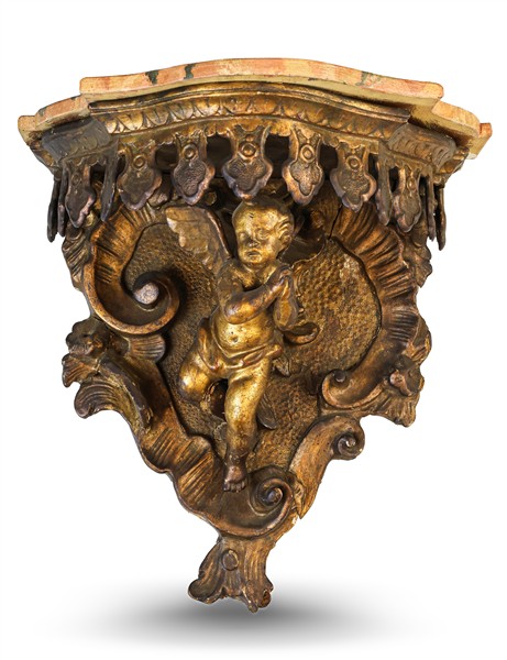 Mensola in legno intagliato e dorato con piano sagomato e sostegno con amorino a tutto tondo su fondo a volute. Secolo XIX. Piano dipinto in finto marmo di epoca successiva (cm 39x39x24) (difetti e restauri)